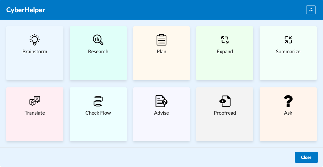 AI support while you write (Brainstorm, Research, Plan, Expand, Summarize, Translate, Check Flow, Advise, Proofread, Ask).